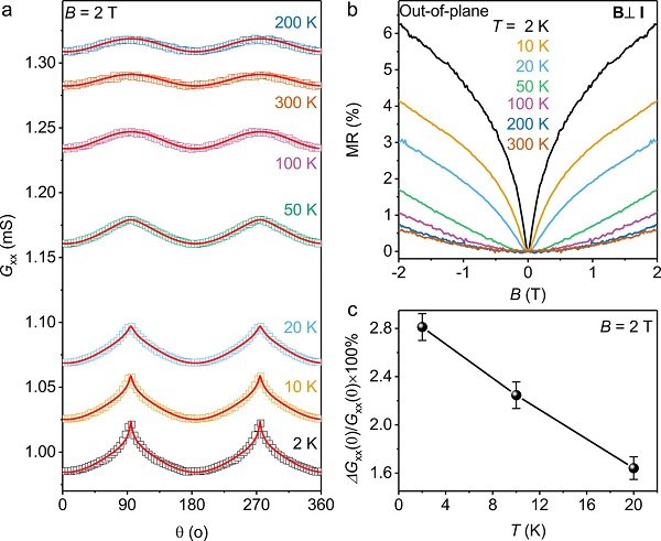 a) 不同温度下的BSTS器件的各向异性磁导,测量磁场大小为2 T;