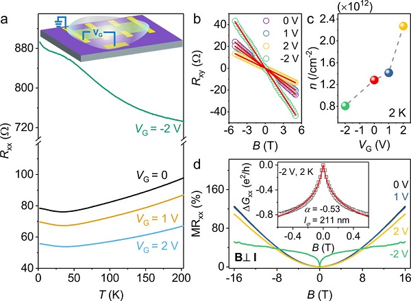 d) 不同栅极电压下,BSTS器件的磁阻曲线,内插为VG = -2 V、T = 2 K的低磁场中测量的WAL效应,红色实线是使用HLN方程的拟合曲线。