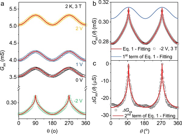 a) 不同栅极电压下,BSTS器件在B = 3 T、T = 2 K的各向异性磁导曲线;