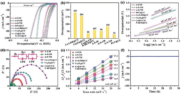 a) A-S-20、A-S-120、A-S-720、Pt/C@CC、Co-LDH@CC、Co3O4@CC和Co@N-CS/N-HCP@CC的LSV曲线;