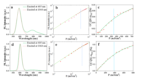 (a, d)上转换光谱图(b, e)上转换荧光激发强度依赖(c, f)上转换荧光产率