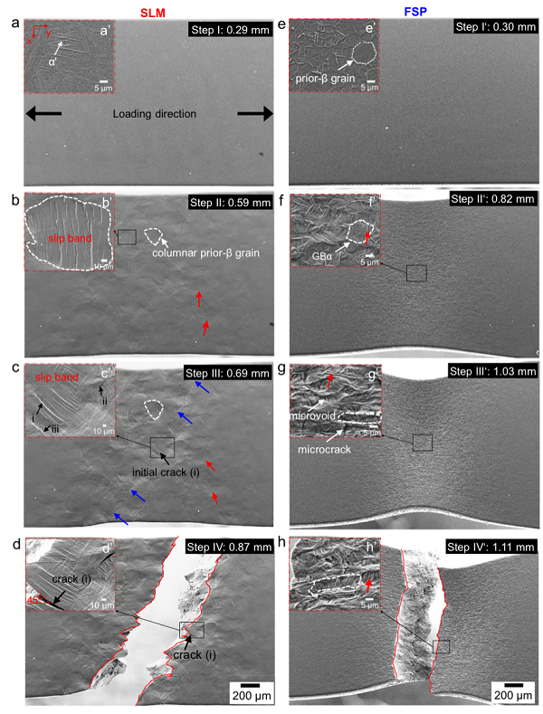 Ti6Al4V钛合金具有优良的耐蚀性、低的密度、高的比强度及好的韧性和焊接性等一系列优点,在航空航天、石油化工、船舶汽车,生物医学等领域得到广泛的应用。选择性激光熔化是一种先进的金属增材制造技术,可用于几何结构复杂的钛合金等零部件的制造,在航空航天、生物医学和汽车工业等领域表现出巨大的优势。然而,与锻造或铸造的钛合金相比,选择性激光熔化(SLM)块材低的延展性,严重阻碍了其在工业领域内更广泛的应用。这是由于材料内部孔隙和针状α′易形成应力集中,导致裂纹萌生,在应变局部化前进行裂纹扩展直至断裂,严重降低了材料的延展性。