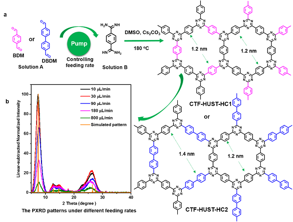 (a)控制单体加料速率合成高结晶性CTFs策略示意图;(b)不同加料速率下的PXRD图