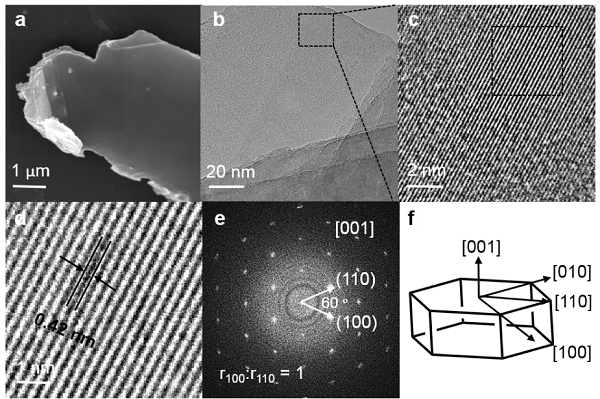 高结晶的CTF-HUST-HC1的SEM图(a)、TEM图(b)、HR-TEM图(c)和(d)、快速傅里叶变换FFT图(e)晶体结构示意图(f)