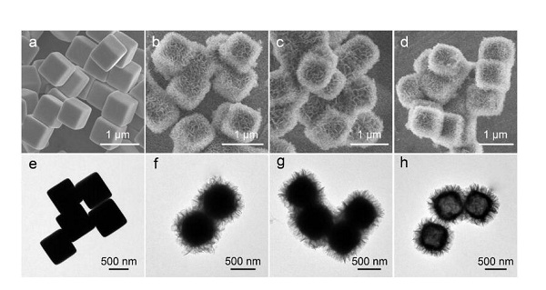 图2.a、e为 Cu2O纳米立方块的FESEM和TEM图;b、f为核壳结构Cu2O@Co(OH)2纳米立方块的FESEM和TEM图;c、g为Cu2O@CuS@Co(OH)2纳米立方块的FESEM和TEM图;d、h为CuS@Co(OH)2 空心纳米颗粒的FESEM和TEM图。