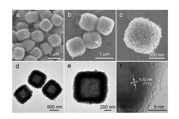 图3.a-c为CuS@CoS2 DSNBs的FESEM图;d、e为CuS@CoS2 DSNBs的TEM图;f为CuS@CoS2 DSNBs的HRTEM图。