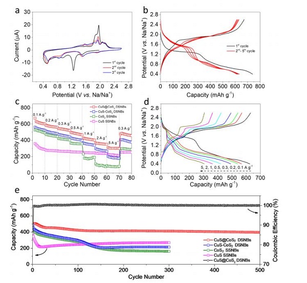 作者通过模板法合成了分级双层空心结构的CuS@CoS2 DSNBs,并测试了其储钠性能。通过合理设计反应的过程,可以实现材料结构和组成的可控调控。其中,CuS@CoS2 DSNBs材料表现出最优的储钠性能,该材料表现出较高的可逆比容量(625 mAh g-1)、优异的倍率性能(在5 A g-1的电流密度下具有304 mAh g-1的可逆比容量)和稳定的循环性能(循环500周,容量保持率为79%)。这一研究结果提供了一种制备高性能复杂空心结构硫化物负极材料的新策略,为钠离子电池的发展和应用,以及复杂空心结构的合成提供了新的思路和方向。