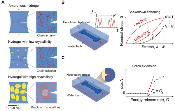 水凝胶在设备和机器中的新应用要求水凝胶在循环机械载荷下保持韧性和强度。当水凝胶在单周机械载荷作用下能够抵抗断裂时,这些增韧凝胶在多周载荷作用下仍然会发生疲劳断裂。水凝胶是人造软骨、关节和椎间盘的理想替代材料。这些应用要求水凝胶具备循环加载下的抗疲劳性能。现在报道的合成水凝胶的疲劳阈值在1到100 J/m2之间,因而设计具有抗疲劳断裂的水凝胶仍是软材料领域的一大难题。
