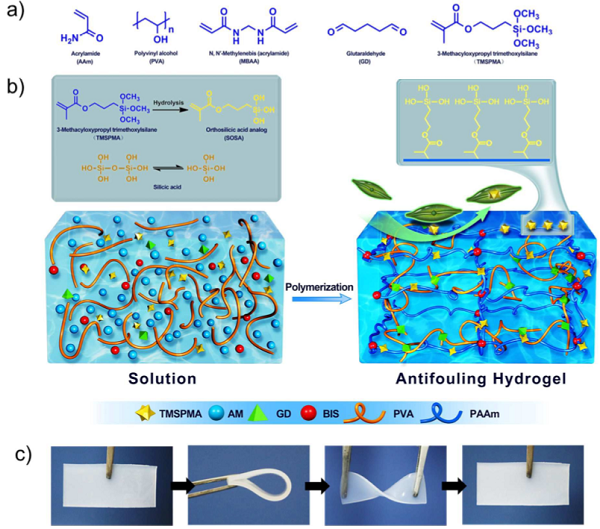 基于此,中科院理化所江雷院士研究团队和海南大学郝万军教授合作首次提出利用原硅酸类似物诱导硅藻摄取,进而干扰硅藻正常的生命活动,最终实现抗硅藻附着8。由于硅藻合成二氧化硅外壳需要大量摄取硅酸,而人和其他海洋生物并不吸收硅酸。针对这一差异,研究团队使用一种人工合成的原硅酸类似物(SOSA),如图8。3-甲基丙烯酰氧基丙基三甲氧基硅烷(TMSPMA),通过共聚固定在凝胶中并水解得到带有三个硅羟基的SOSA,制得柔韧的抗硅藻附着凝胶。在水凝胶中,SOSA具有与原硅酸非常类似的三个Si-OH,并且还有一个在水中稳定的C-Si键。当这些物质被凝胶表面的污损硅藻摄取之后,由于其中的C-Si键相对比较稳定,不会像原硅酸一样缩合形成二氧化硅外壳,所以硅藻的正常生命活动将出现紊乱,最终影响硅藻的附着行为。详细研究表明,含SOSA的水凝胶具有良好的抗硅藻粘附性能,SOSA的抗硅藻作用是有针对性的,只有试图粘附在SOSA水凝胶表面的生物体受到影响。SOSA水凝胶具有高效、环保的特性,在海洋防污方面具有广阔的应用前景。研究团队将相关研究成果以“Preventing diatoms adhesion using a hydrogel with orthosilicic acid analog as deceptive food”为题发表在国际著名期刊Journal of Materials Chemistry A上。