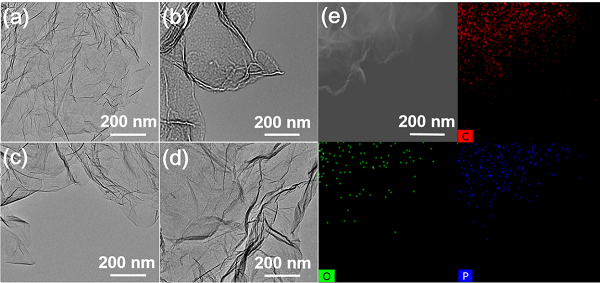 图1、不同石墨烯(a) G600,(b) G800,(c) PG800,(d) PG800S的TEM形貌比较及PG800S的EDS mapping图。