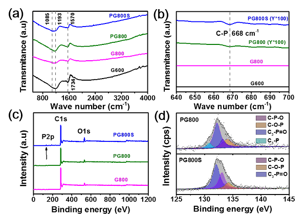 从红外结果可初步确定:在668 cm-1处,碳晶格中形成了C-P键并且经过进一步高温钝化处理C-P键信号明显增强,含量进一步增多;而在1085-1193 cm-1区间内是多种官能团的信号叠加区,包含有氢键的P=O基团伸缩振动;P-O-C(芳环系)中含O-C键的伸缩振动;含-OH的P=OOH键伸缩振动。