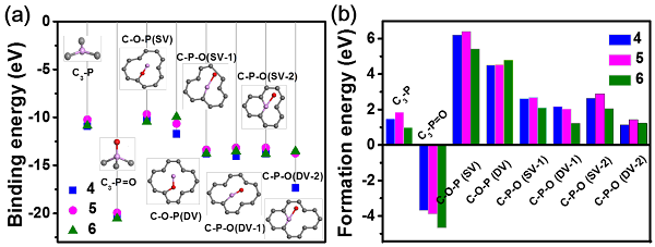为了进一步验证确定含磷构型的稳定性,基于XPS结果,可以构建了如图3 (a) 所示八种不同构型的磷构型模型,通过结合密度泛函理论计算结果,由结合能结果可以看出C3-P=O具有最高的稳定性,C-P-O构型次之;且从形成能的结果得出C3-P=O是实验条件下最易形成的构型,其次为C-P-O。二者的结论进一步验证了由XPS分析所得磷构型演变规律的合理性