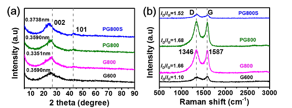 磷构型演变过程中引起的材料微晶结构变化。由XRD结果可知在活化和钝化的过程中,(002) 峰发生明显左移,进一步通过布拉格方程计算得出石墨烯的层间距明显增大,(101)峰指示的类石墨化度也不断提高;由相应的Raman结果ID/IG值的变化趋势进一步印证了(101)峰的所得结果。这主要归因于C3-P=O这一构型以类三角锥形的特殊凸起形式存在于碳晶格中且P原子大多同时和三个C原子相连而减少了晶格中的空位缺陷,因而带来了层间距的增加和类石墨化度的提高。