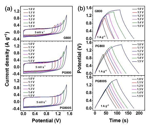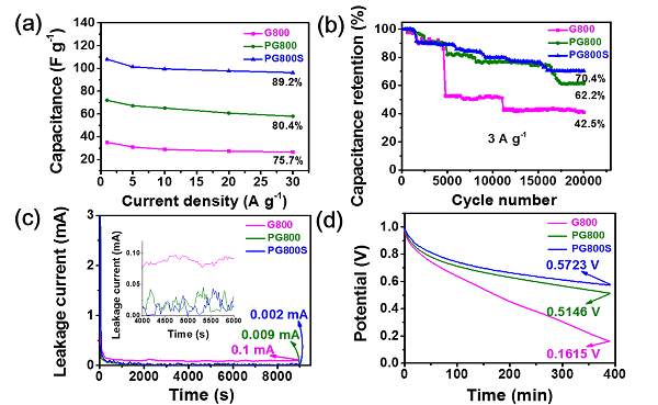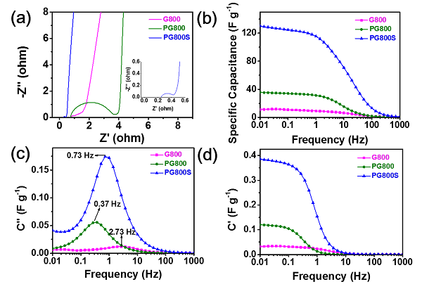 含磷构型对材料阻抗和电容的影响。由EIS的尼奎斯特图观察可知,中频区半圆的的直径变化反映出初步磷酸活化会使不稳定的含磷官能团与石墨烯的含氧官能团在片层间形成无序搭接而导致等严重的界面传荷阻抗;而经过高温钝化稳定化后,不稳定的含磷构型转化为更加稳定的C3-P=O构型以及少部分亚稳态的C-P-O构型,尤其是C3-P=O构型使得石墨烯晶格变得更加有序完整且层间距增大,再加上在面外有凸起的氧原子增加了材料的表面润湿性,使得界面阻抗大大降低;在低频区,PG800,PG800S的直线部分具有更加理想的双电层电容行为,说明磷掺杂效应大大减小了电解液扩散阻抗,对于电容的提升起到主要作用,也从侧面说明磷掺杂促进了表面润湿性的改善。而(b)(c)(d)进一步表明了C3-P=O在提高材料表面润湿性、倍率性能、可逆快速充放电能力、比电容提升等方面的积极作用。这再一次充分了说明了C3-P=O构型在电化学行为中的重要作用。
