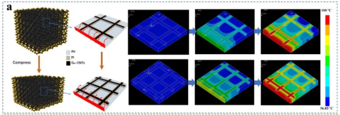 以石墨烯交联的弹性碳纳米管海绵体为模板,通过均匀复合,不仅可以实现了界面高效热传导和弹性形变的可调,而且赋予了高模量刚性聚酰亚胺复合材料高导热(电)和压缩回弹性。有限元分析和动态热管理器件应用分别从理论和实际角度,证明了Gw-CNT/PI复合弹性体可以实现在不同压缩形变下热传导的有效调控,该结果表明该导热弹性体是未来极端复杂环境热管理领域的理想材料之一。