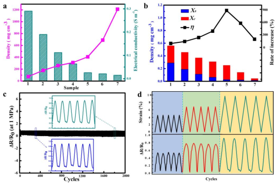 图7. Gw-CNT/PI复合材料的(a)密度以及(b) 弹性形变与导电率的调控关系,(c,d)不同压力下的传感性能及其循环稳定性