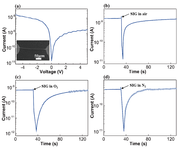 图2(a)ZnO纳米线肖特基势垒器件在暗态下的电流-电压曲线,内嵌图片为ZnO纳米线的FESEM图像;表面离子栅调控的ZnO纳米线在空气中(b)、氧气中(c)及氮气中(d)的电流-时间特性。