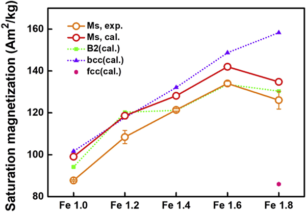高熵合金(HEAs)是一种新兴的材料,通常由一种主要元素和不同浓度的溶质元素组成的合金,HEA包括(近)等原子比的多主元素和最大构型熵。这种设计合金方法具有高断裂韧性、优异的强度-延展性平衡、高温强度、热稳定性、耐腐蚀、电阻率和耐氢脆化特性的高熵合金。然而,HEA的研究大多数集中在理解和优化结构上,而功能特性的报告相当稀少。最近,3d过渡金属元素的软磁HEAs,证明HEA在软磁应用中的巨大潜力,但仍有一些关键的科学问题尚未解决。例如,许多含Al HEA形成有序的B2相,但是B2和BCC相之间的元素划分尚未阐明。饱和磁化强度随BCC量的增加而增加,随FCC相量的减少而增加的原因尚不清楚。为了解决这些问题,本文设计了不同Fe和Cr比(x = 0、0.2、0.4、0.6、0.8)的非等原子Al0.1(Fe1 + xCoCr1-xMn)0.9HEAs,并进行了系统的微观结构和磁性表征。