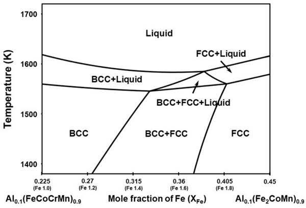 图 9 计算的准Al0.1(Fe1 + xCoCr1-xMn)0.9合金二元相图