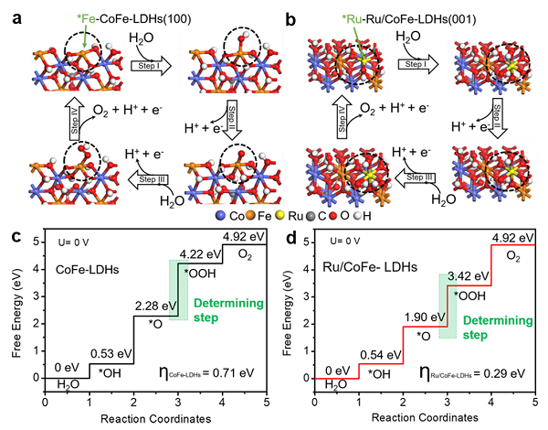 密度泛函理论计算表明,在水滑石表面的单原子钌活性位点比水滑石本身的铁活性位点具有更低的理论过电位,更加有利于OER过程的进行。这从侧面说明了负载单原子钌以后,催化剂活性位点的转变。