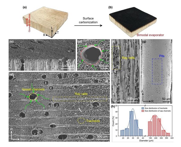 图2.表面炭化的巴沙木的结构表征。 (a, b) 天然的巴沙木和表面炭化的巴沙木的照片; (c) 表面炭化的巴沙木的三维SEM图; (d) 表面炭化的巴沙木的SEM图的顶视图;(e) 表面炭化的巴沙木的SEM图的顶视图的放大图; (f) 薄壁细胞的SEM图;(g) 导管通道的SEM图的放大图;(h) 导管通道和管胞的尺寸分布图