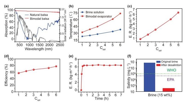 表面炭化的、双峰多孔的巴沙木解决了长期的太阳能海水淡化过程中盐分积聚的问题。巴沙木的双峰多孔的和互相连接的微观结构起到了关键性的作用。巴沙木具有高水汽蒸发速率,表现出优异的稳定性和耐用性,而且在防止盐分积聚的同时保持高效的水汽蒸发速率。该项研究成果为可持续地产生饮用水提供了很大的希望,尤其是从海水来获得饮用水。