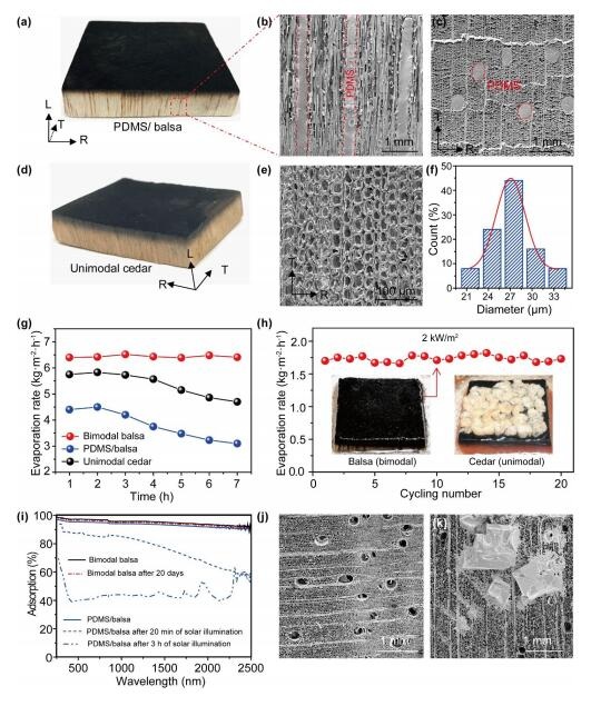 图4.(a) PDMS/巴沙木材料的照片;(b, c) PDMS/巴沙木材料的SEM图的侧视图和顶视图; (d) 雪松的照片;(e)雪松的SEM图的顶视图; (f) 雪松的微通道的尺寸分布; (g)三种木材基太阳能蒸发器的水汽蒸发速率; (h) 表面炭化的巴沙木的循环性能; (i) 表面炭化的巴沙木和PDMS/巴沙木材料的吸光度的变化;(j) 循环20天后的表面炭化的巴沙木的SEM图的顶视图;(k) PDMS/巴沙木材料在太阳照射45分钟后的SEM图的顶视图