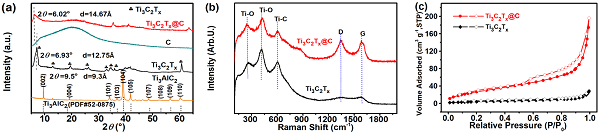 图3 Ti3C2Tx MXene与碳球复合前后的XRD,拉曼和比表面积表征