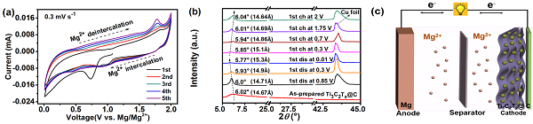 (c)Ti3C2Tx@C作为镁离子电池正极材料的结构示意图