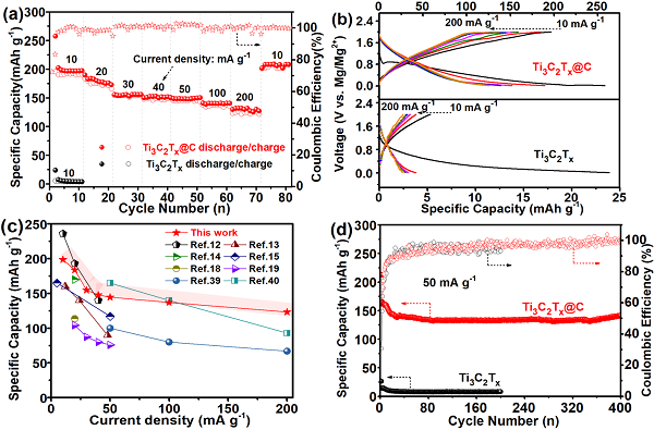 (a)Ti3C2Tx和Ti3C2Tx@C在不同电流密度下的倍率性能。