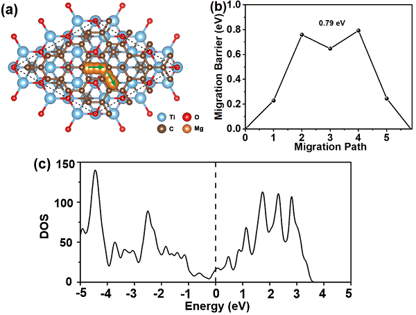 图7 DFT计算阐明Mg2+在Ti3C2Tx@C正极材料中的迁移路径、迁移能垒和态密度表征