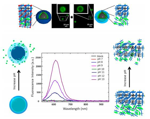 (下)通过发射光谱证实,pH引发的溶胀和从MagGel胶囊中释放染料的示意图。