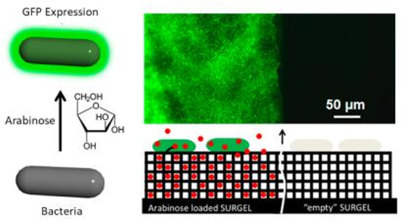 图 12 在Surgel基体上,P. putida pJN::gfp细菌培养24 h时后的示意图和荧光显微镜图像