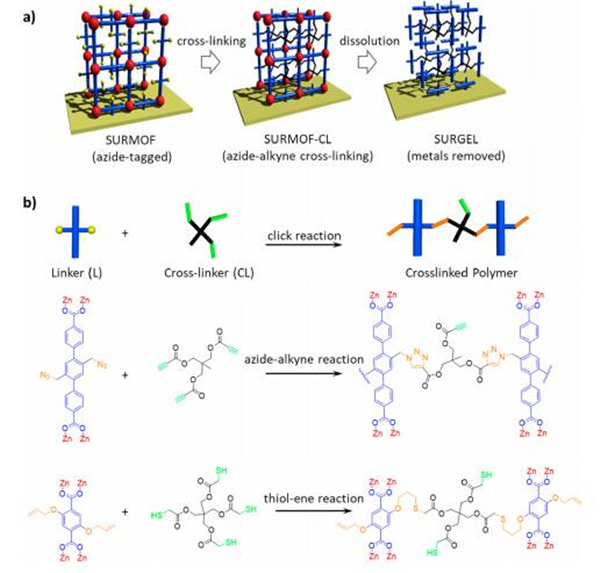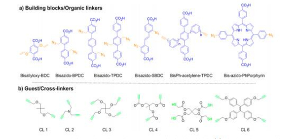 (b)正交功能位点。例如:接头骨架内的叠氮化物和烷氧基,与CL分子相互作用,点击反应机制共价互连MOF结构。