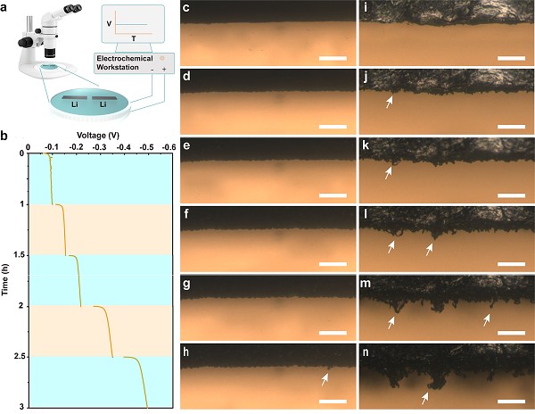 c-h) MOPEs中锂沉积过程的光学照片,比例尺50 μm(下同);
