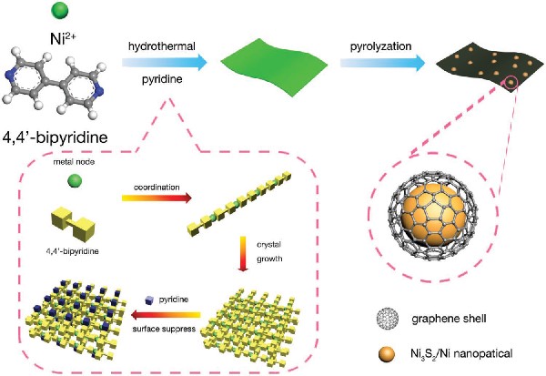 从镍基MOFs前驱体制备2D氮掺杂Ni-Ni3S2@C纳米片的示意图。