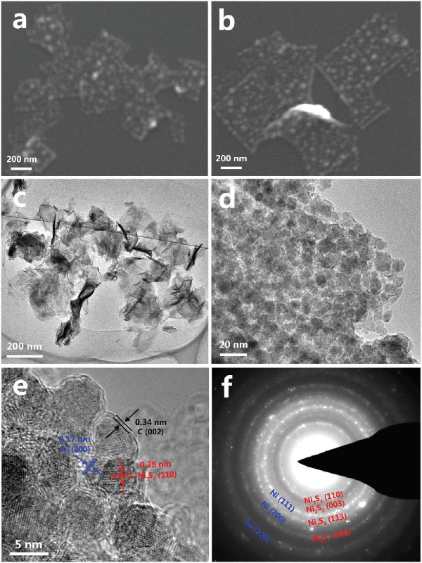 f) 相应的SAED图像,其中两组衍射环分别归属于Ni和Ni3S2。