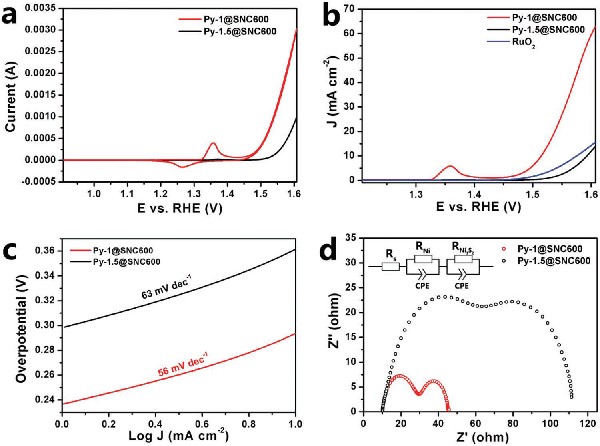 图5 不同吡啶加入量2D Ni-MOFs煅烧后的OER活性测试