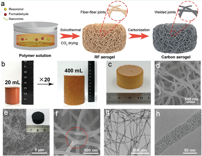 e,f)获得的硬碳气凝胶的SEM图像,显示纳米纤维网状结构和纤维-纤维的焊接点(红色圆圈);