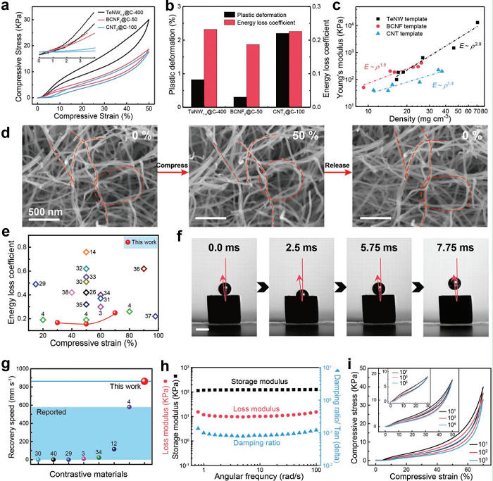 d) BCNF @ C气凝胶的原位SEM显示在50%压缩和释放后的结构变形。比例尺为500nm。 e)BCNF @ C和其他先前报道的材料的能量损耗系数,图表中的数字代表相关参考文献;
