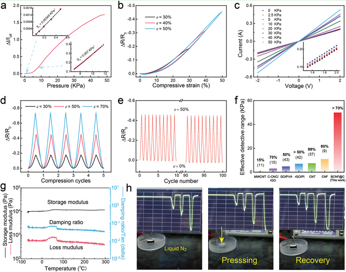 a)BCNF2 @ C-50碳气凝胶对压力的电流响应,插图显示两种具有不同灵敏度的线性区域;