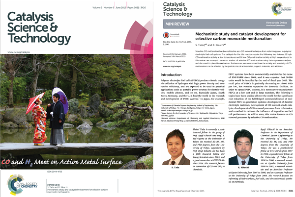 罢了,看到上面学霸们的各种求婚骚操作后,是不是感觉很Romantic?别急,我们再来看看终极天秀—蒂花之秀,那就是SCI期刊封面秀恩爱。在催化类化学期刊 Catalysis Science & Technology(影响因子:5.827)上,东京大学化工系的Shohei Tada发表的一篇小综述文章Mechanistic study and catalyst develop–ment for selective carbon monoxide methanation,这篇文章的封面就是他和夫人的结婚照。两人在桥上撑伞相遇,深情对视,眉目传情,却寓意着文章中表达的学术内容:H2和CO在活性金属催化剂表面相遇时,就会发生化学反应,实现一氧化碳甲烷化。哎,确认了眼神,你就是那个对的人,这是不是美得让人窒息的神仙眷侣…