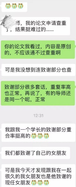 不过听说,毕业论文中原创率最高、引用率最低的部分,非致谢莫属。由此致谢也就成了很多同学自我发挥、展现真我的部分。因此论文的致谢的查重率最低呦!NO!前两天看到一条关于论文致谢部分致谢的女票居然和学长的致谢的女朋友一样…,但此时的内心是不是崩溃了呢?不知事件的真假,但是,如果是你,是不是很想哭呢?
