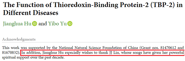 不知大家是否还记得去年浙江大学第二附属医院眼科研二的胡江华同学在其发表在 Oxidative Medicine and Cellular Longevity 期刊上的第一篇SCI论文:The Function of Thioredoxin-Binding Protein-2 (TBP-2) in Different Diseases 的致谢部分,感谢了歌手林俊杰,表示在过去十年里,林俊杰的歌曲给了她强大的精神支持。这一致谢却引起了很多网友的关注,甚至共鸣。