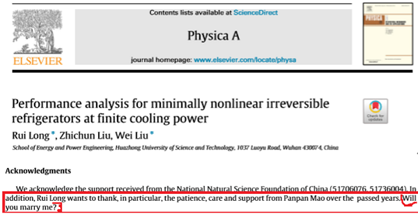 之前华中HTH官网地址 大学的一位学霸,他在SCI期刊Physica A上发表的论文《Performance analysis for minimally nonlinear irreversible refrigerators at finite cooling power》的致谢部分,结结实实撒了一大波狗粮:向相恋的女友求婚。是不是瞬间觉得日常的恩爱秀都是弱爆了。特别是最后一句话“Will you marry me?”各位是不是被Get到了呢?听说最后成功获得女神的倾心。