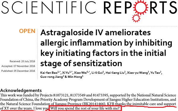 时间再往前,就读于南京中医药大学的一位学霸小哥哥,在Nature子刊scientific reports上发表的一篇影响因子5.228的SCI论文中的致谢部分向女神求婚成功,女友成功“升级”为妻,并因此红遍网络。哎,着实被一把狗粮给噎哭了。。。