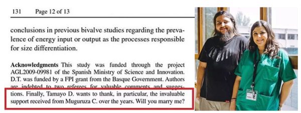 别慌!再来看看国外的恩爱秀!生活在西班牙北部的巴斯克的David Tamayo 和他的女朋友都是研究人员,他的一篇文章《Mussels, the Secondary Protagonists of this History》致谢部分的最后一句“Will you marry me?”向女友求婚 。据说是David 先是假装自己担心致谢部分出问题,让女友 Caroline 帮忙检查,这样就确保她能看到,然后…然后就在她看的时候,突然拿着戒指单膝跪地…是不是感动得无法呼吸的画面感…