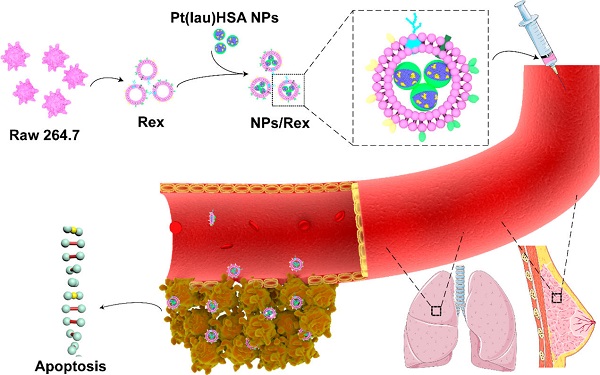 图一、外泌体平台(Rex)负载Pt(lau)HSA NPs进行有效治疗乳腺癌的示意图