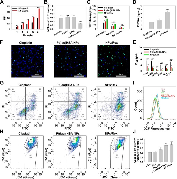 (J)用PBS、HAS、Rex、顺Pt、Pt(lau)HSA NPs和NPs/Rex孵育12 h的4T1细胞的半胱天冬酶3/7活性。