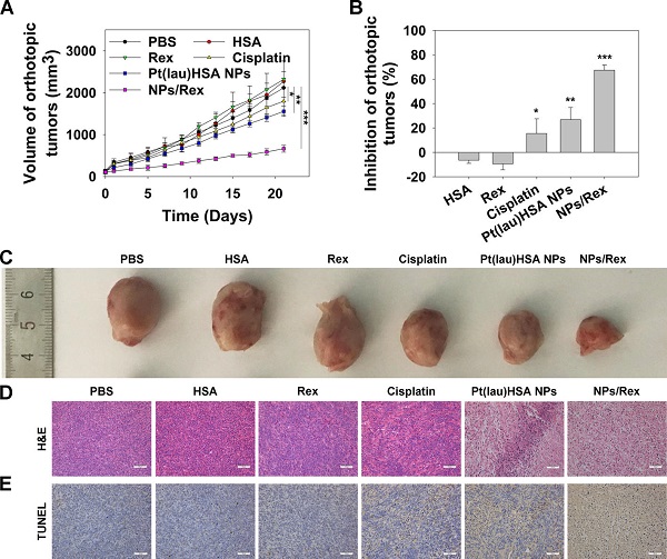 图五、Pt(lau)HSA NPs和NPs/Rex等组对小鼠体内肿瘤的治疗效果